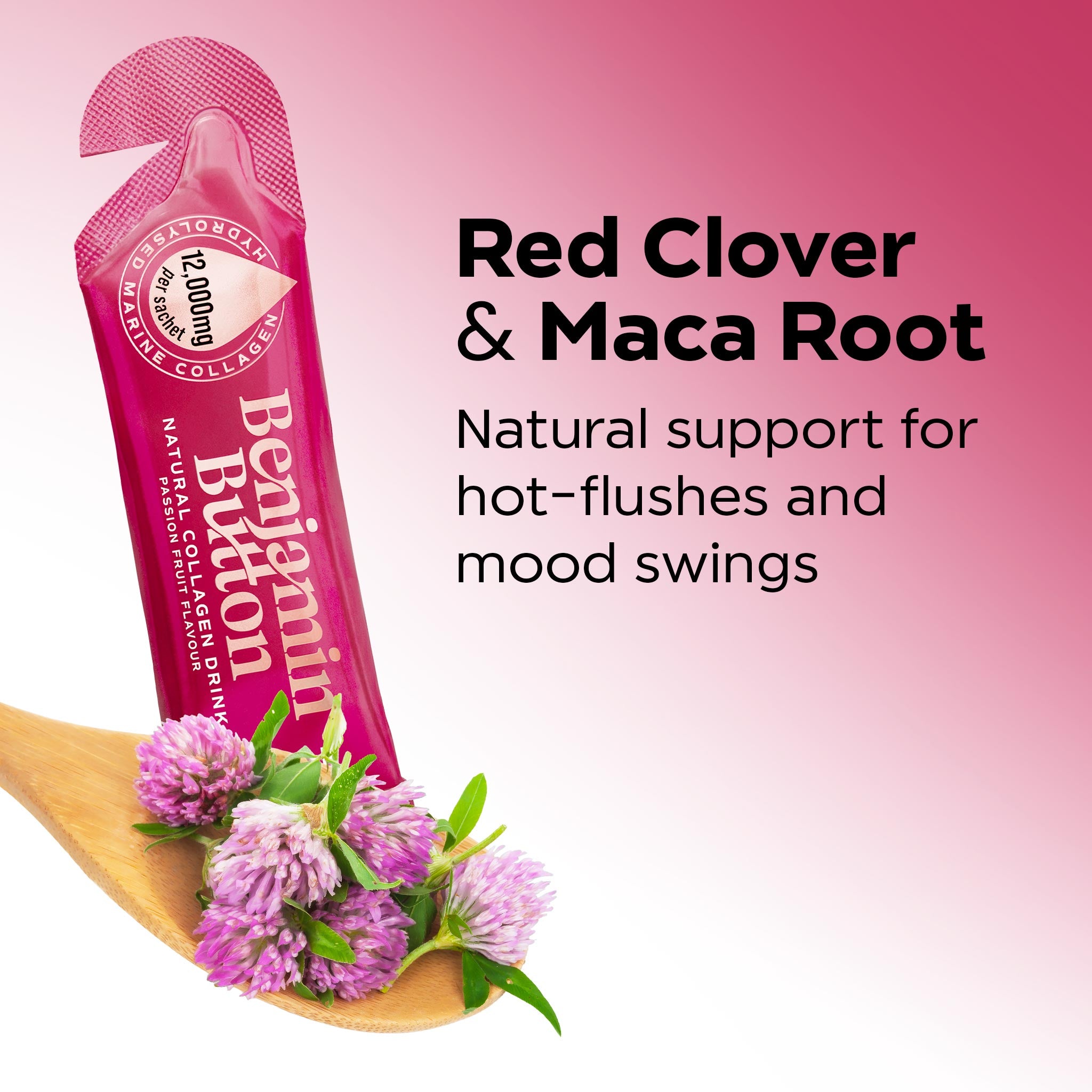 أكياس كولاجين سن اليأس بنكهة فاكهة العاطفة – عبوة 14 (إمداد لمدة أسبوعين) – 12,000 ملغ كولاجين بحري مع البرسيم الأحمر، الفيتامينات والماكا