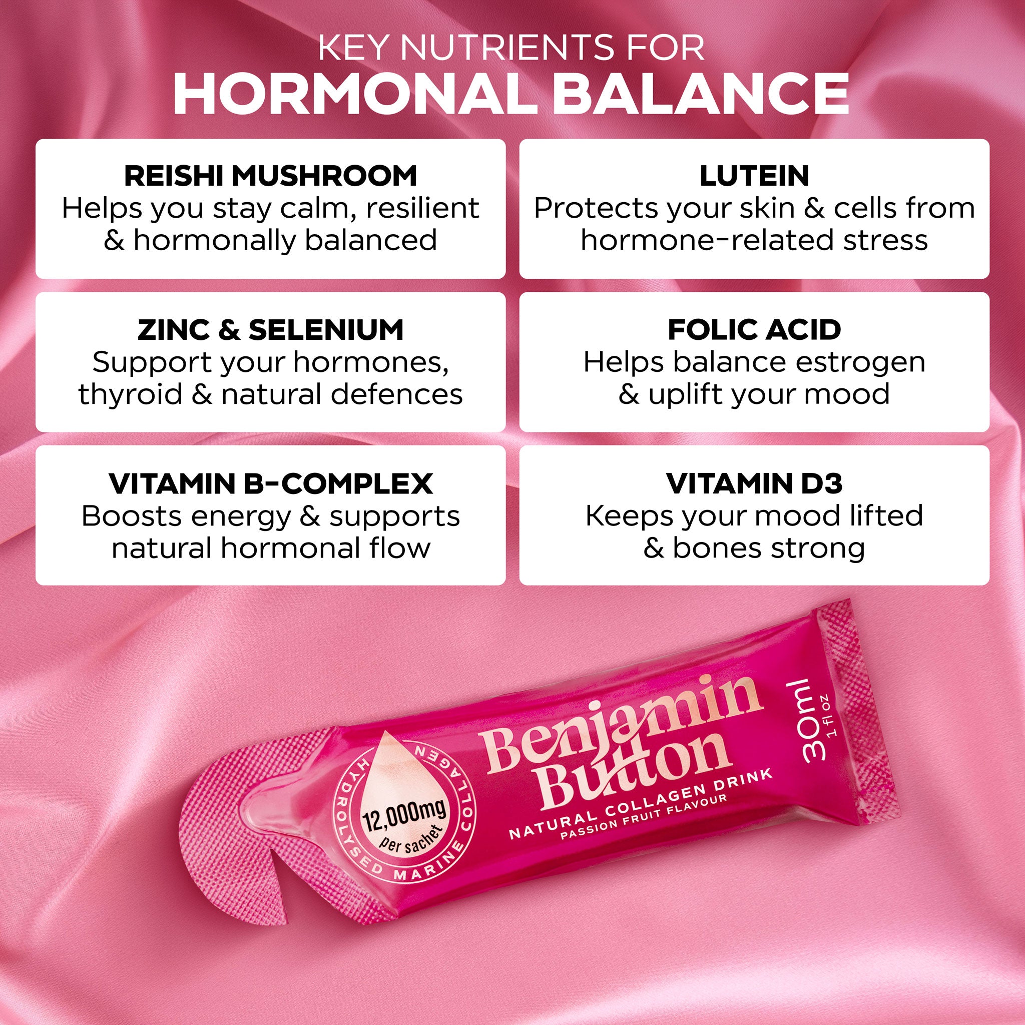 مستخلص البرسيم الأحمر (مصدر طبيعي للإيزوفلافونات)، وجذر الماكا تساعد على توازن الهرمونات، وتحسين المزاج، وتقليل التعب — مثالية للنساء الباحثات عن دعم هرموني يومي. - اللوتين، الزنك، والسيلينيوم ومستخلص خميرة الجلوتاثيون تحمي من الإجهاد التأكسدي، مما يساعد على وضوح البشرة وصحة الخلايا بشكل عام.