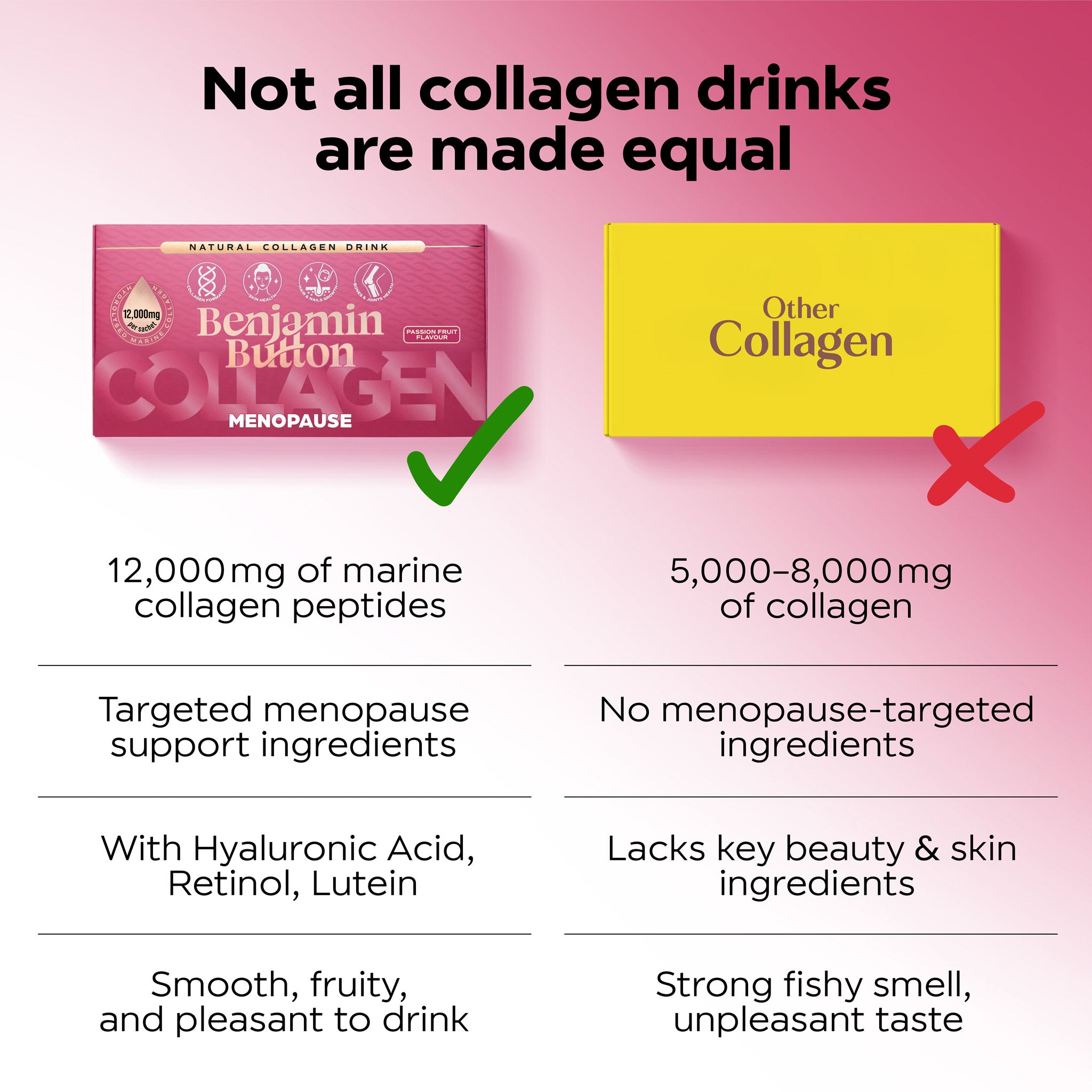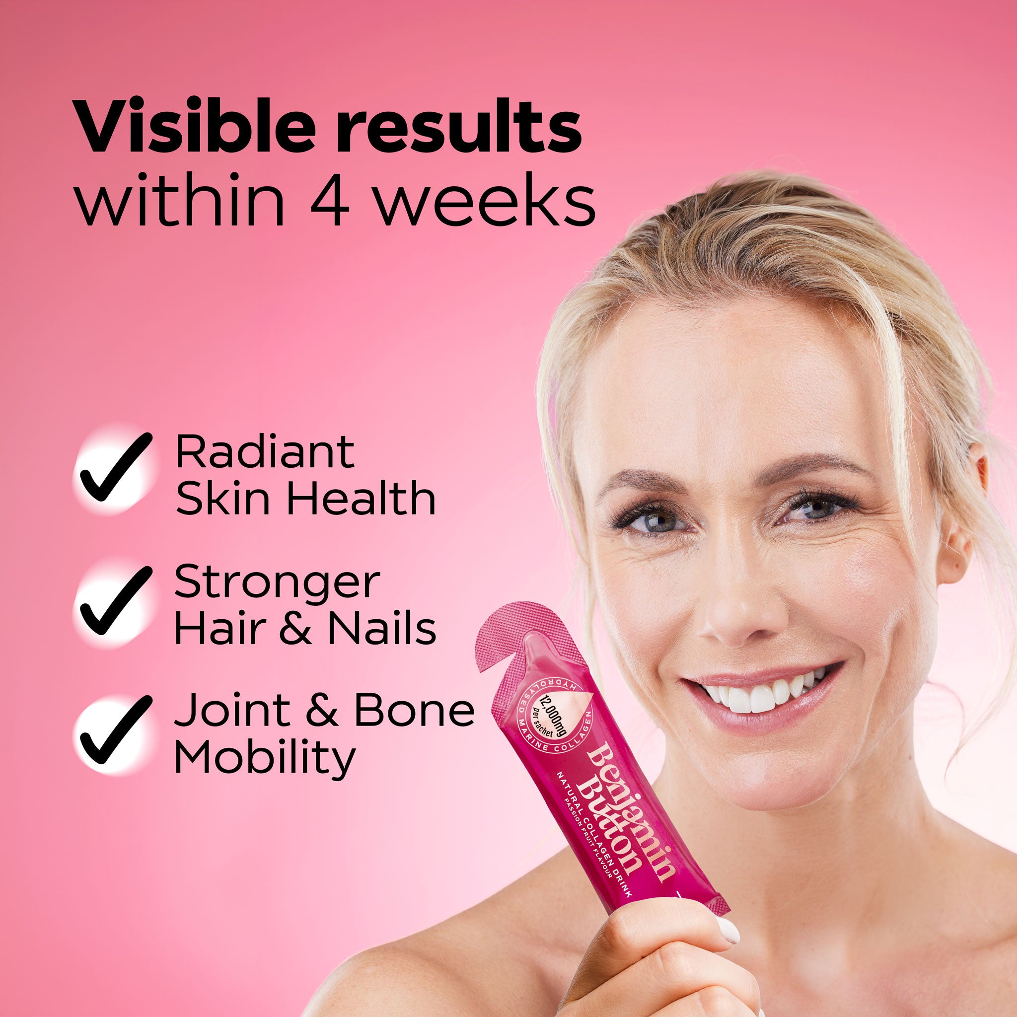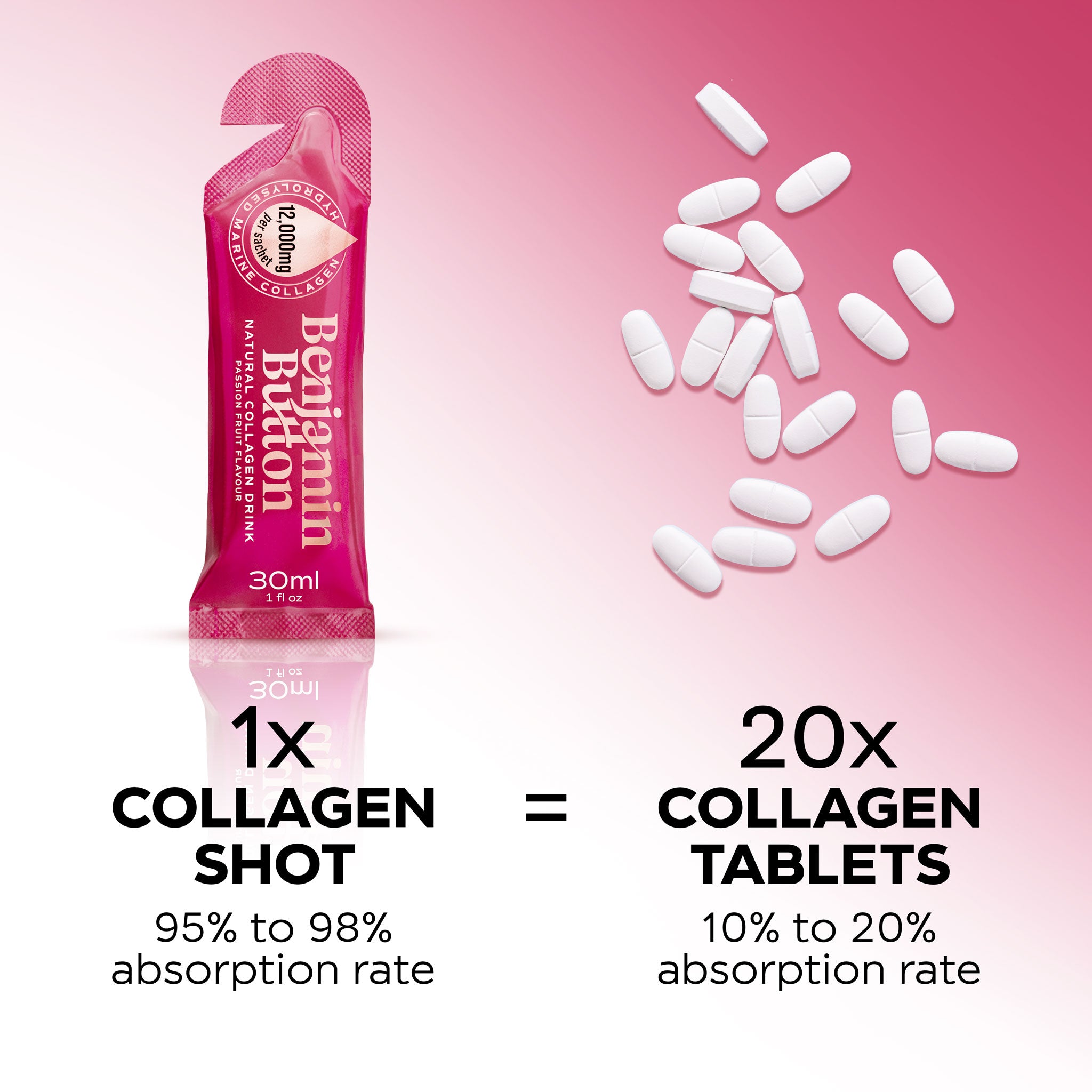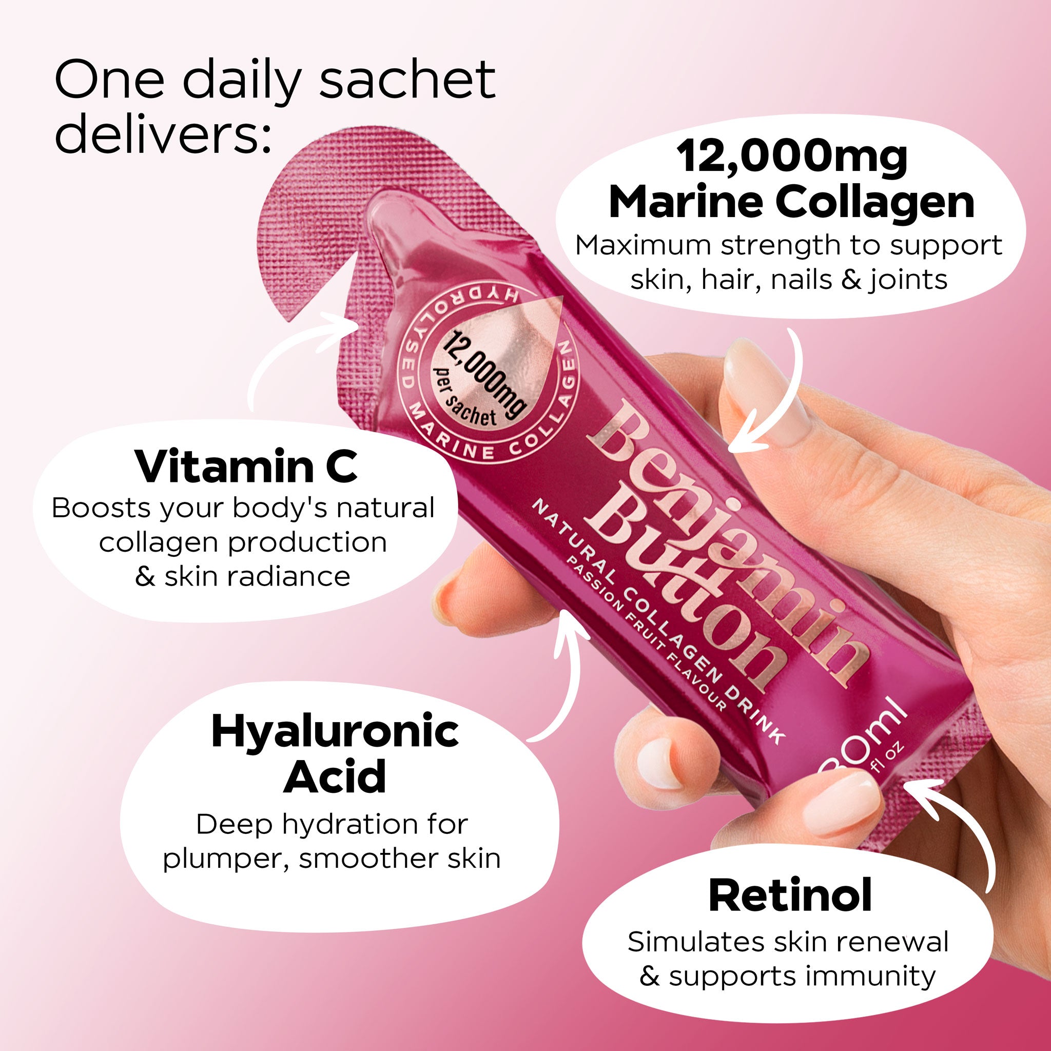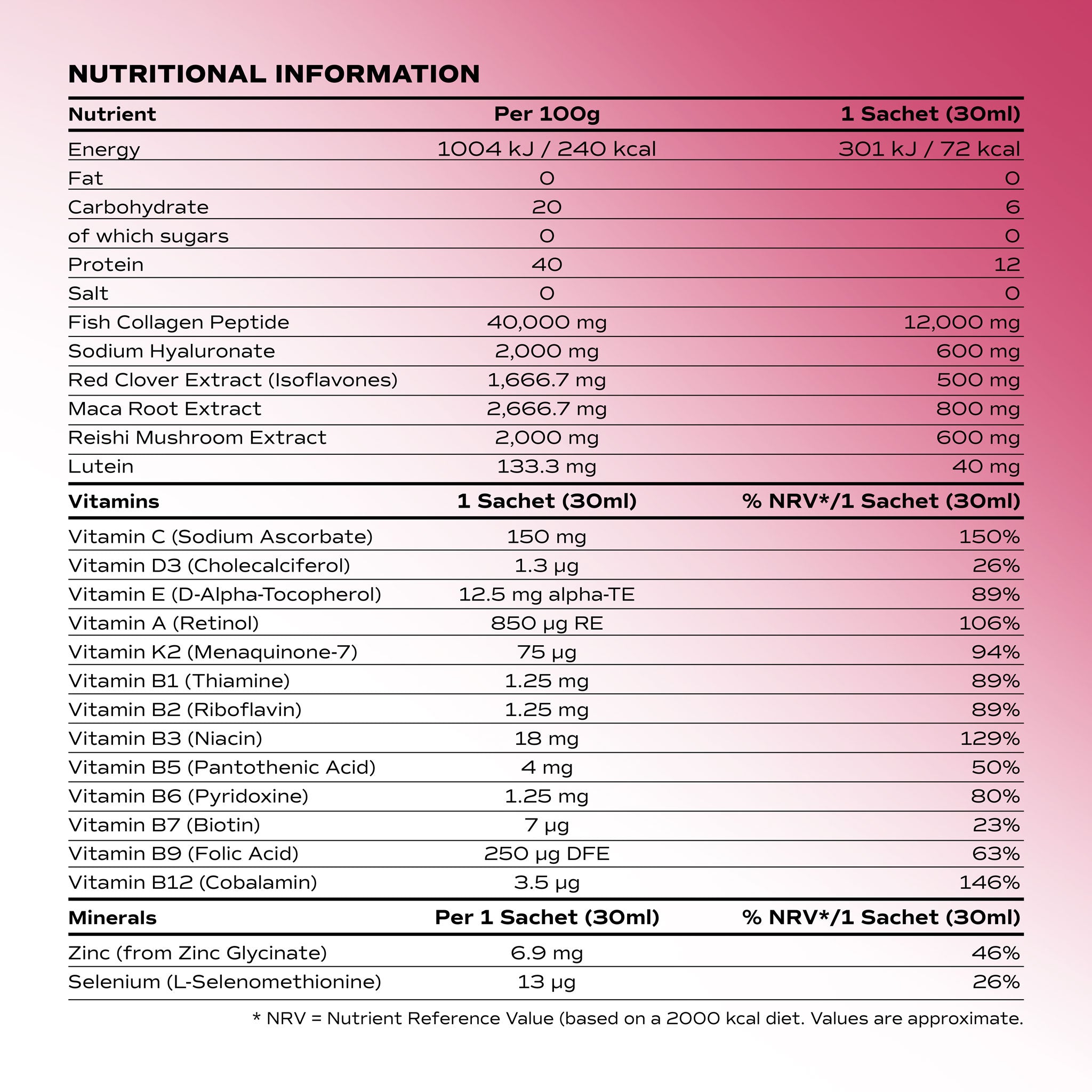 كل كيس 30 مل يحتوي على 12000 ملغ من الكولاجين البحري عالي الجودة ومع فيتامينات A، B1، B2، B3، B5، B6، B7، B9، B12، C، D3، E، K2، خالٍ من المكسرات، الغلوتين، اللاكتوز، الصويا، والإضافات والمحليات الصناعية، وهو حلال. كل كيس يحتوي على 44 سعرة حرارية مقابل 6 غرامات من البروتين.