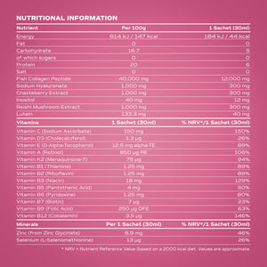 كل كيس 30 مل يحتوي على 12,000 ملغ من الكولاجين البحري عالي الجودة ومع فيتامينات A، B1، B2، B3، B5، B6، B7، B9، B12، C، D3، E، K2، خالٍ من المكسرات، الغلوتين، اللاكتوز، الصويا، والإضافات والمحليات الصناعية، وهو حلال. يحتوي كل كيس على 44 سعرة حرارية مقابل 6 غرامات من البروتين.