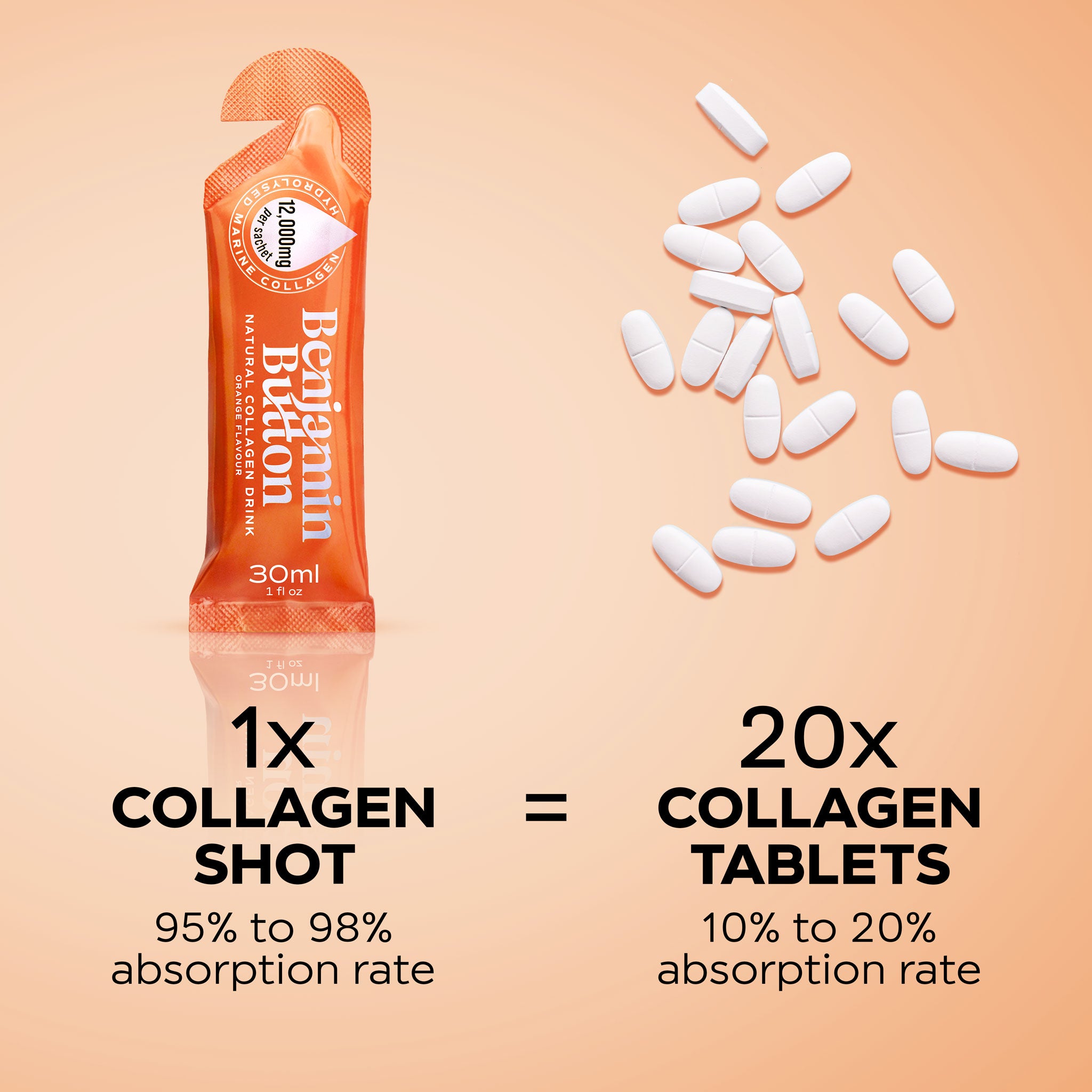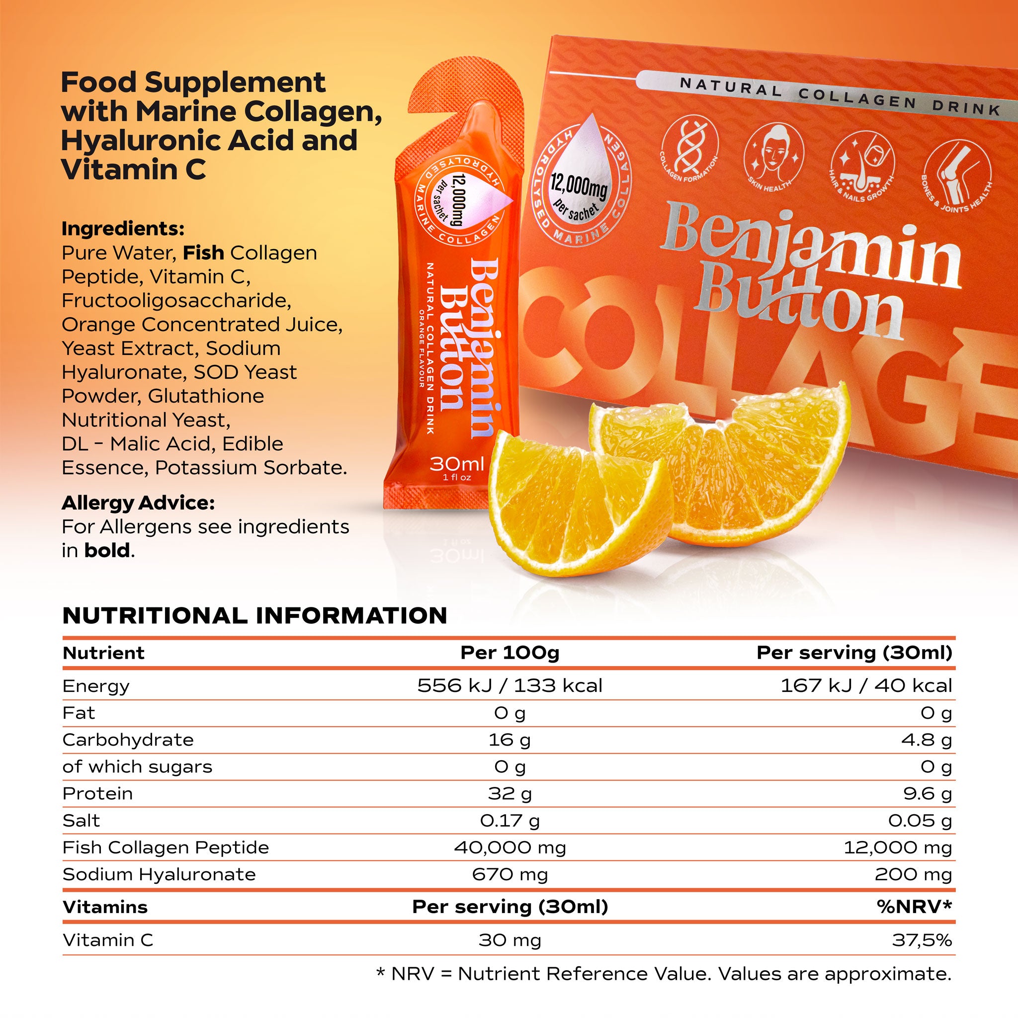 Chaque sachet de 30 ml contient 12 000 mg de collagène marin de haute qualité et 60 mg de vitamine C, est exempt de noix, gluten, lactose, soja, d'additifs et d'édulcorants artificiels et est Halal. Chaque sachet contient 40 calories pour 5 g de protéines.
