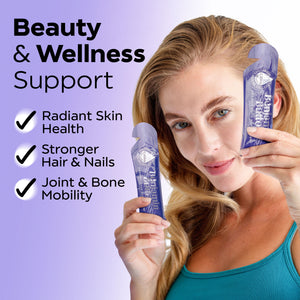 A ready‑to‑drink 30ml sachet delivering 12,000mg hydrolysed marine collagen with Vitamin C and Hyaluronic Acid to support skin hydration, elasticity, hair and joint health. Naturally flavoured with blackcurrant for an easy daily beauty boost.