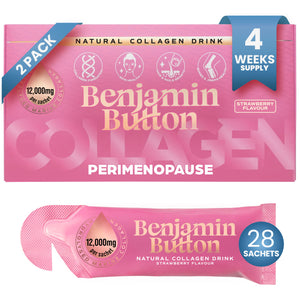 Perimenopaus Kollagen Jordgubbspåsar – 14-pack (2 veckors förbrukning) – 12 000 mg marint kollagen med Munkkörsbär, vitaminer och hyaluronsyra